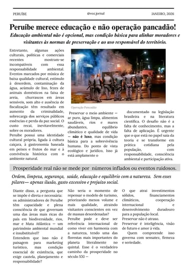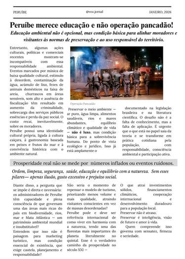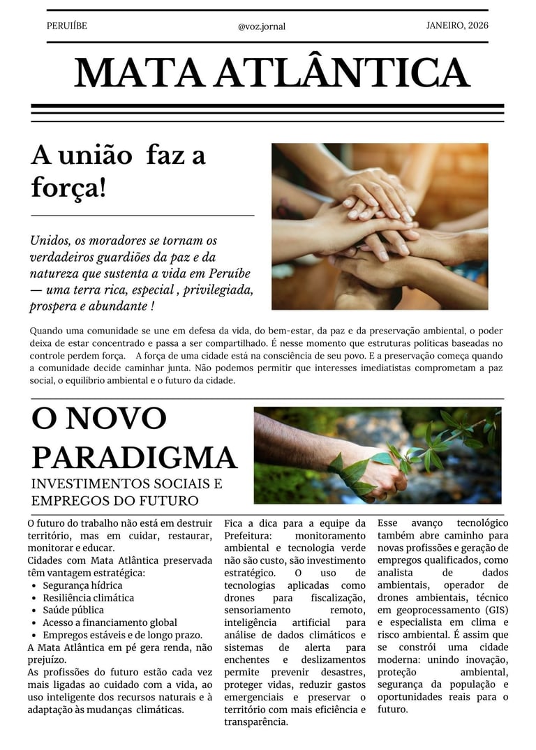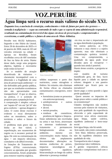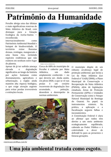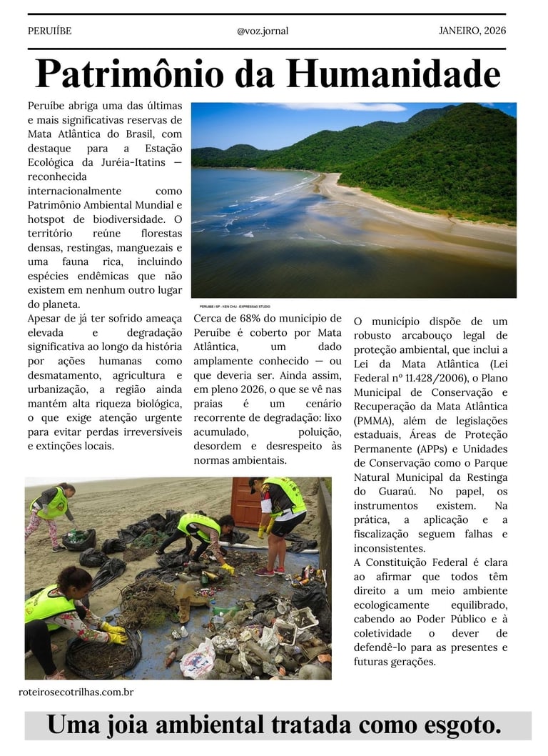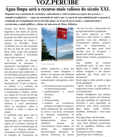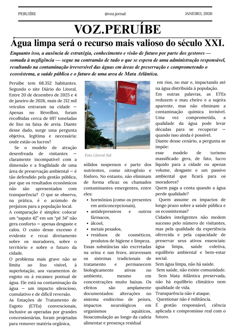 Peruíbe abriga uma joia ambiental de valor mundial, mas segue sendo tratada como território descartável. A Mata Atlântica e a água não são opcionais: são a base da vida e da economia local. Em um século em que a água é o recurso mais valioso, ignorar a preservação é comprometer o futuro. Desenvolvimento sem responsabilidade não é progresso — é perda.